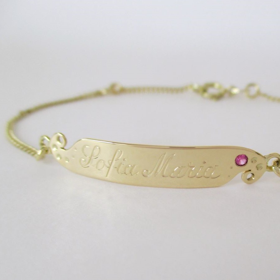 ‘Welkom, lief klein meisje’, babyarmbandje, goud met robijn, handgravure