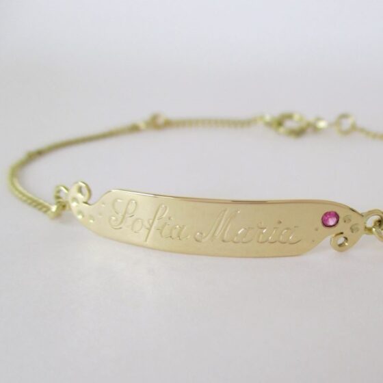 ‘Welkom, lief klein meisje’, babyarmbandje, goud met robijn, handgravure